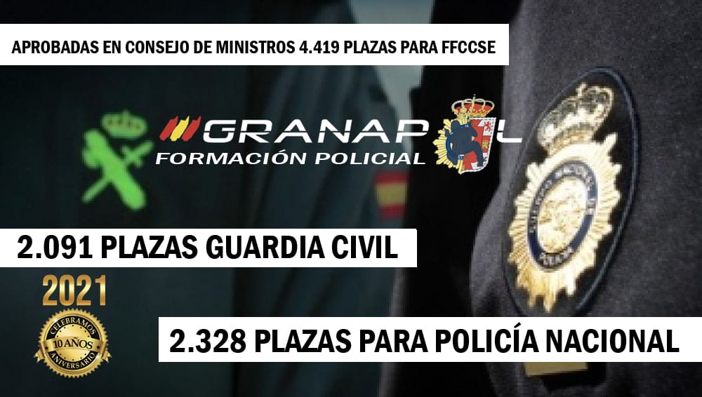 El 25 de mayo de 2021 se ha hecho oficial la convocatoria de plazas aprobadas para Policía Nacional y Guardia Civil. En esta ocasión el Ministerio del Interior ha aprobado 4.419 para las Fuerzas y Cuerpos de Seguridad del Estado Español. Dichas plazas se dividen de la siguiente manera: